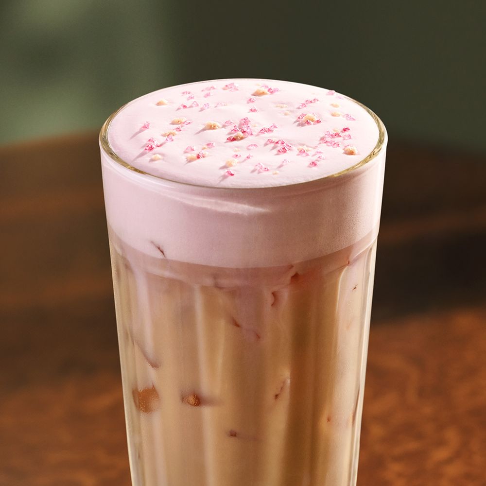 An Iced Chai Latte topped with a creamy cold foam with notes of cherry and a crunchy topping for a springtime twist on a favorite.